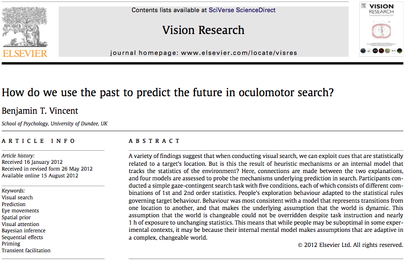 Vincent, B. T. (in press) How do we use the past to predict the future in oculomotor search? Vision Research, doi:10.1016/j.visres.2012.08.001